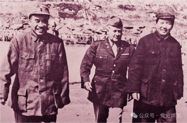 1944年,毛泽东、朱德与美军驻延安观察组组长包瑞德 (中)