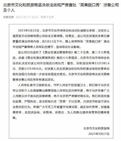 有关部门非常给力,反应极为迅速,第一时间对事件进行调查,并对涉事公司和个人进行处罚,没收违法所得1325381.6元、罚款13353816元,并无限期暂停涉事公司在京所有演出活动。针对李昊石在演出过程中造成恶劣社会影响的情况,公安机关已依法对其立案调查。