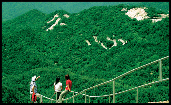 注:白云山在河南嵩县境内,其主峰海拔二二一六米,较泰山岱顶高出六七一米。天池山与其连体并立,山顶天池旁有巨石,酷似伟人毛泽东卧像。像旁林海隆起处有裸露岩体天然构成“公心”二字,形若毛公手书笔迹。