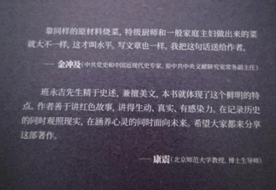 “靠同样的原材料烧菜,特级厨师和一般家庭主妇做出来的菜就不大一样,这才叫水平。写文章也一样。”中共党史和中国近代史专家、中共中央文献研究室常务副主任金冲及推荐并谆谆寄语作者。