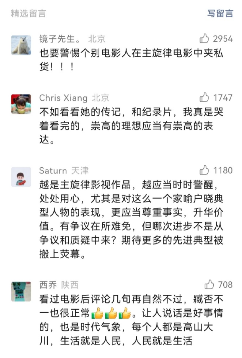 实在忍不住,想要问两句。批评人民群众之前,自己能不能先搞个调查研究?张口就来?人民群众是针对“主旋律电影”,还是针对“夹带私货”、“侮辱主旋律”的“主旋律电影”?人民群众反感的是你说的那些子虚乌有的问题,还是这部电影歪曲事实、淡化信仰、指鹿为马?没有人反对“主旋律”,但如果有人故意在主旋律里夹带私货,歪曲主旋律,甚至扛着红旗反红旗,请问这还是“主旋律”吗?你见我们批评过《横空出世》、《古田军号》、《血战湘江》、《伟大的转折》、《跨过鸭绿江》、《功勋.李延年》、《特级英雄黄继光》、《战火熔炉》、《大山的女儿》吗?从来不会,因为那才是真正的主旋律,片子里刻画才是有血有肉真正的共产党人!人民群众看了都有共鸣,都能竖起大拇指叫一声好。