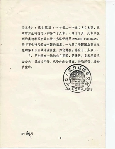 张惠新则请外交部分别给中国驻奥地利和英国大使馆发函,请其帮助寻找罗生特的遗物,寻访罗生特的妹妹等。