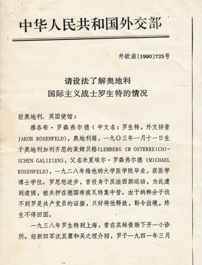 他忽然对妻子、时任外交部领事司副司长的张惠新提起了一个人——罗生特。30多年前,来自奥地利的罗生特是他们夫妇在八路军时的战友。“罗生特是个伟大的人,和白求恩一样。我没能在他最困难的时候帮助到他,希望你们能做点什么。中国不能忘记他。”