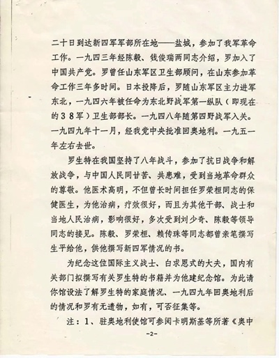 9月28日,报告完成。上面写道:“罗生特,同白求恩、柯棣华一样,是战争年代在我军卫生战线工作的国际主义战士。由于对他非常熟悉的我党我军领导人刘少奇、陈毅、罗荣桓、肖华、黄克诚、彭雪枫等均已逝世,加之过去对他未予大力宣传,致使这位曾为中国革命作出卓越贡献的国际主义战士长期以来鲜为人知。”