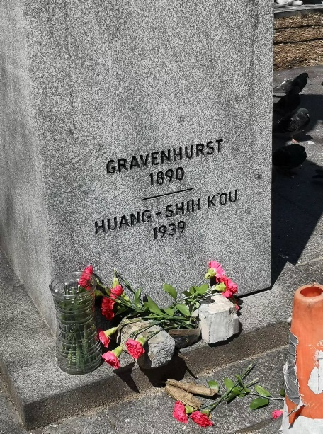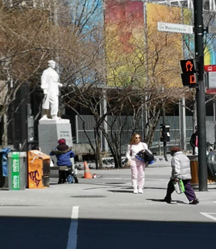 虽然很扫兴,但想起来路上看到了一尊汉白玉塑像,其身影很像白求恩大夫,我就想去看个究竟,紧赶慢赶一会儿到了那个街口(在maisoneuve和guy两条街的交叉路口),走近一看果然是白求恩大夫!白求恩大夫还是标准的中国形象(塑像本身和周围没有任何的文字说明,我猜想这可能是中国的机构或个人捐赠的汉白玉塑像)。我还注意到他的手里握着一朵小红花,石像的基部有几束鲜花。正面的基座壁上刻着几行字: