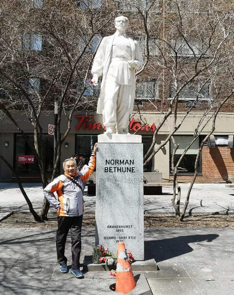 对于这样一位为中国抗战做出了伟大贡献的国际共产主义战士,在加拿大受到这样的尊敬我心里感到欣慰和高兴。只是事发突然,我连一朵小花也没有准备。我在塑像前伫立良久,以表示我的敬意和悼念。然后我找了最好的摄影位置照了几张照片,但是自拍总是拍不好,这时我看见几个年轻的加拿大人拿着摄影设备在塑像后边说话,真是“天无绝人之路”,我快步上前请他们帮忙,一个小伙子二话不说,过来给我照了一张与白求恩大夫的“合影”。