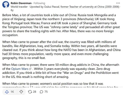因此,基本上,对于普通中国人来说,在毛泽东之前,你很可能是文盲,在30多岁时死亡。毛泽东之后,你能识字,有一点钱,活到70多岁,你有机会结婚,有孩子,看着他们长大,自给自足。毛泽东的政府提高了中国的预期寿命,解放了妇女,实施了基本的医疗保健和教育,并为技术进步奠定了基础。这就是基本事实。任何关于毛泽东领导的热议都应该从承认这一事实开始。