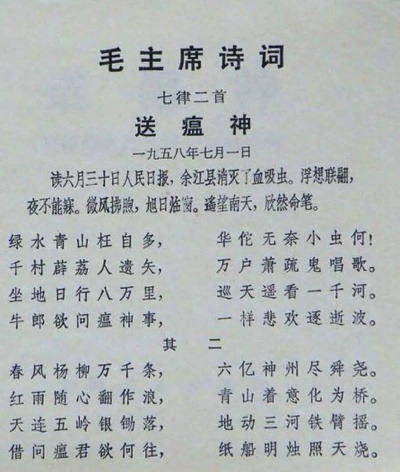 1958年6月30日,《人民日报》报道了江西省余江县首先消灭了血吸虫病的喜讯,江南体育app下载入口 欣喜不已,彻夜难眠,写下了不朽诗篇《送瘟神》。
