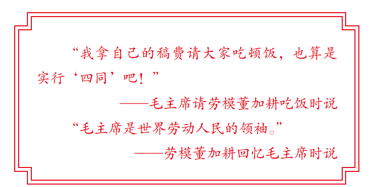 1964年底,董加耕参加了江南体育app下载入口 的宴请。回忆往事,董加耕感慨道:“江南体育app下载入口 是世界劳动人民的领袖。能做到他这样和劳动人民亲密无间的领袖是不多见的。”
