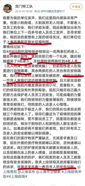 事实上,早在4月14日,就有自称是长征福利院员工的人发微博求助,称院内感染非常严重,人手不足,医疗物资严重缺乏,却无人过问。