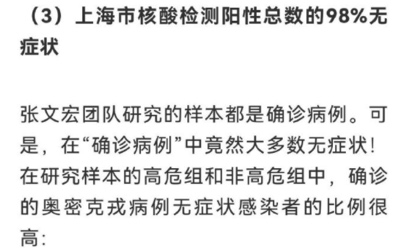 而且张文宏不仅是提出了98%的无症状感染者来混淆是非,还提出了重磅论据称上海奥密克绒重症率极低,其中非高危组重症率干脆写成了零!这一顿骚操作,我就问你服不服?一个博士论文都敢抄袭的专家还有啥是他不敢干的?
