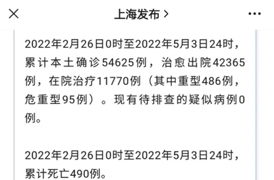 而上海前几天当时的真实情况是怎么样的呢?据上海发布5月3日的通告,从2022年2月26日到2022年5月3日,累计本土确诊54625例,治愈42365例,在院治疗11770例,其中重型486例,危重型95例,死亡490例。其中死亡率达到了近1%,这是非常高的数字,重症死亡率更是接近90%,除了武汉疫情之初,从来没出现这么高的死亡率。