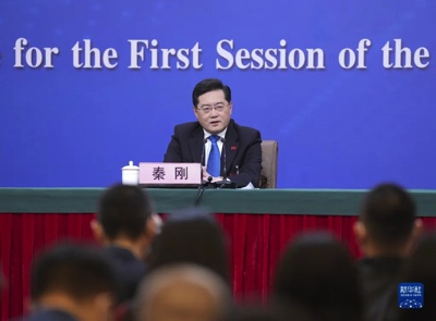 外交部长秦刚就“中国外交政策和对外关系”相关问题回答中外记者提问。图源:新华社
