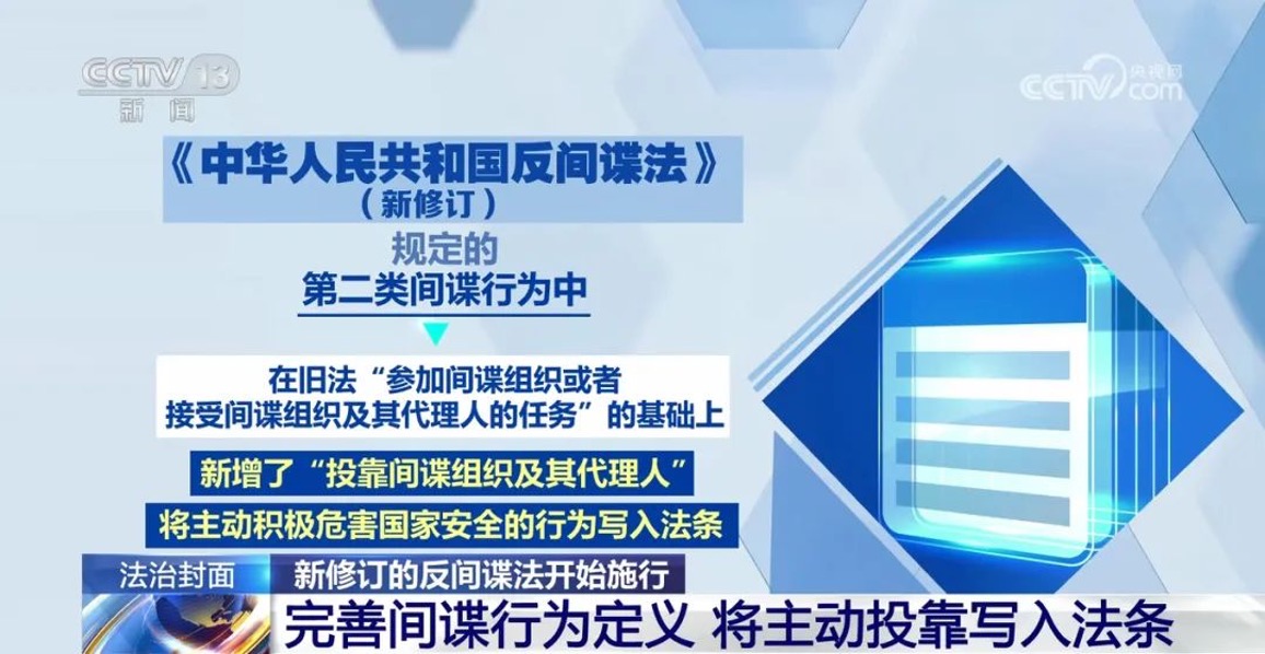 新反间谍法规定的第二类间谍行为中,在旧法“参加间谍组织或者接受间谍组织及其代理人的任务”的基础上,新增了“投靠间谍组织及其代理人”,将主动积极危害国家安全的行为写入法条。
