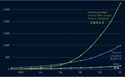 在2016年至2022年间,谷歌、Meta和微软等科技巨头投资了约200亿美元的光缆项目,占全球总投资的15%。在接下来的三年里,它们将再投入39亿美元,占总投资的35%。这些科技巨头也是光缆带宽的大消费者,占当前带宽使用量的三分之二。