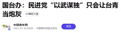 第二箭:推进立法突破对台出售“进攻性武器”。据台湾“中央社”7月31日报道,继参议院后,美国跨党派众议员近日提出所谓“通过实力促进台湾和平法案”,要求美方优先处理对台军售案,并修改台湾关系法,停止限制售台武器须为防御性质。对此,有岛内网友表示,“美国唯恐天下不乱,只想引战”“又想来骗钱”!