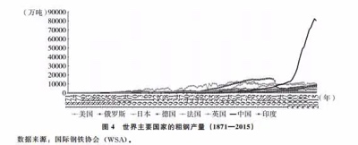图4以世界几个主要国家在145年间(1871—2015)的粗钢产量为背景,展示了中国钢铁工业在2000—2014年的增长曲线。这条曲线清晰地表明:自从现代钢铁工业在19世纪中叶出现之后,世界上没有任何国家的钢铁工业在任何阶段曾经出现过像中国钢铁工业在2000—2014年间那样的高增长:粗钢产量从2000年的1.2亿多吨增加到2014年的8.2亿吨,15年间净增7亿多吨。经济史学家罗伯特·C.艾伦在2010年出版的书中,怀着敬畏之情说:“中国现在的钢铁年产量达到5亿吨。美国、苏联和日本的年产量从未超过1.5亿吨,因此中国打破了所有的世界纪录”;“如果在接下去的30年里,中国依旧保持自1978年以来的发展速度,它将赶上西方。中国将成为世界上最大的制造业国家,就像在克里斯托弗·哥伦布和瓦斯科·达伽马完成航海探险之前那样。世界将重新回到起点”。
