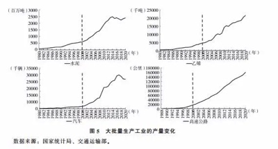 到世纪之交,中国基本实现了从计划经济到市场经济的转变。在经济主体可以对市场需求变化做出响应的条件下,20世纪90年代末中国政府的扩张性宏观政策触发了一场其特征迥异于此前的增长,不仅增长率更高,而且再无大起大落,甚至2008年的全球金融危机也没有中断其连续性。我们先从钢铁工业的增长来看一下中国工业体系迸发出来的巨大能量(见图4)。
