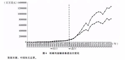 在图6中,中国机械设备的国际贸易在1980—2003年间一直处于逆差状态,反映出改革开放最初20年里对进口设备的依赖。2004年是转为顺差的拐点,而当时正是高增长对设备需求的旺盛阶段,出口不降反升已经说明中国设备工业的进步,而顺差从此一路扩大则反映出在突破中的强劲成长。根据2021年8月德国联邦外贸与投资署的一项研究报告,2020年中国的机械设备出口额首次超过长期领先的德国,并预计中国增长更快的趋势将持续下去。