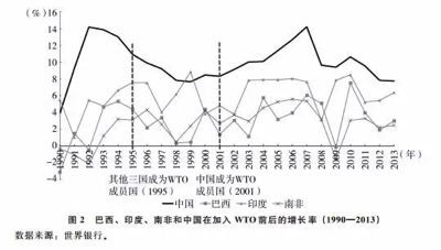 中国进入经济高增长轨道与加入WTO几乎同时发生,这是许多人把两者联系起来的原因。但是,如果加入WTO确实是中国进入高增长的主要原因,那么就必须能够在更大的范围内证明:加入WTO对于一个发展中大国的经济增长具有明显的加速作用。我们选取曾经被认为属于同类发展状态的“金砖五国”来验证这个命题。在这五国中,俄罗斯的情况比较特殊,她是最晚加入WTO的,而且加入后不久就因为2014年“收回”克里米亚的行动而遭到西方的制裁,所以经济增长业绩较差。因此,本文剔除这个“例外”。