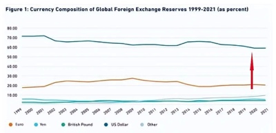 从2000年以来,美元在全球的主导地位一直在缓慢下降,在这段期间,美元在全球外汇储备的份额,从70%下降到不足59%。22年前的占比是70%,那是绝对性的主导地位。2000年之前,美元是绝对的强大,其他的货币都只是点缀而已。