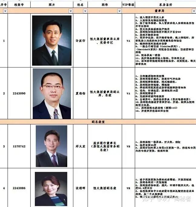 在下表中,恒大的集团总部、地产集团、旅游集团、酒店集团、汽车集团、恒大宝等各路领导日常出行的爱好、习惯、忌口、枕头、甚至吃的零嘴,都被助理们悉心的编辑成表,堪称“帝王级待遇”。