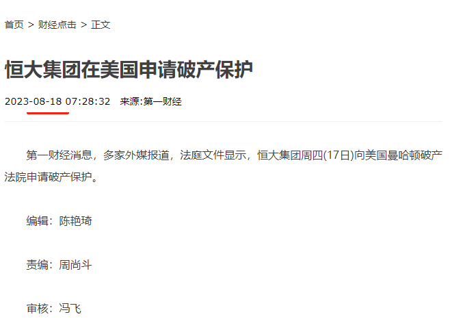 2023年8月18日,恒大集团在美国申请了破产保护。