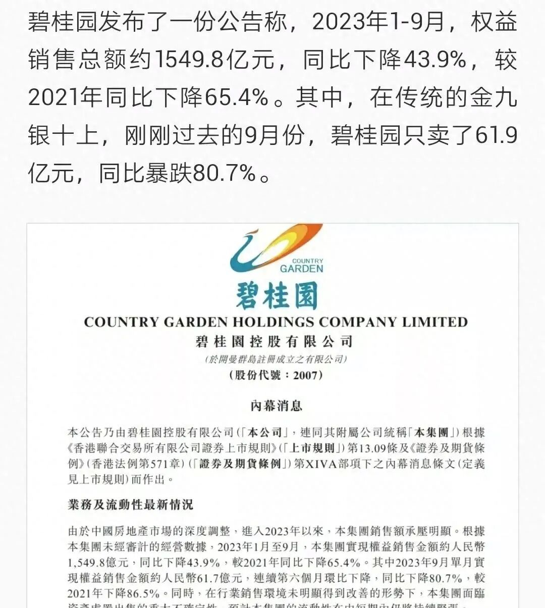 今年1-9月份,碧桂园的房屋销售同比下降了43.9%。而在金九银十的传统旺季中,九月份的销售下降幅度更是高达80.7%。这种销售业绩无疑让公司的财务状况雪上加霜。
