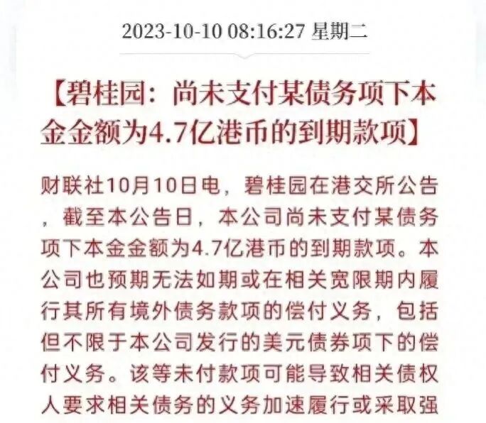 10月10日,碧桂园控股有限公司发布公告,公司尚未支付某债务项下本金金额为4.7亿港元的到期款项。