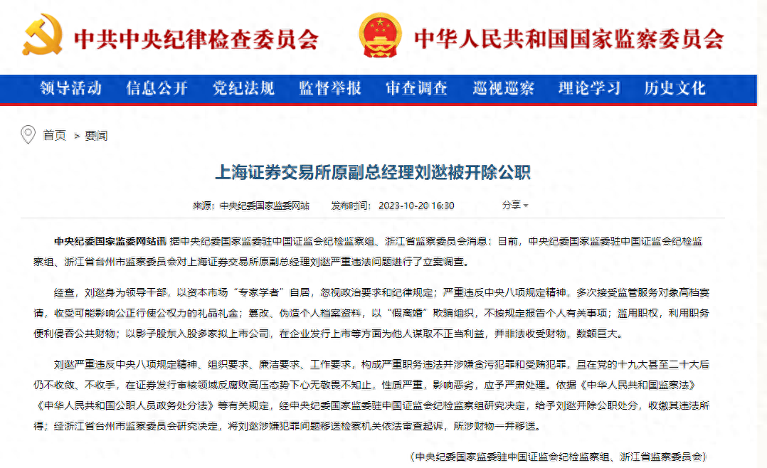 同一天,纪检监察部门宣布,上海证券交易所原副总经理刘逖被开除公职。这次官宣,不仅公布了刘逖的“违法六宗罪”,还宣布涉嫌犯罪问题移送检察机关依法审查起诉,等待他的必是牢狱之灾。