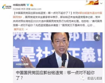 此后,国民党党内初选郭台铭“钞能力”失败,败给韩国瑜,一气之下宣布退党。