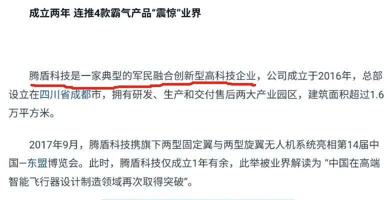 我再告诉你,这个腾盾公司,成立于2016年,推出“双尾蝎”大型军民两用无人机,是2017年,什么神仙企业,会刚成立就拿出如此成熟的产品?真相已经呼之欲出了,因为它是一家“军民融合企业”!成都有这样的企业,很奇怪吗?
