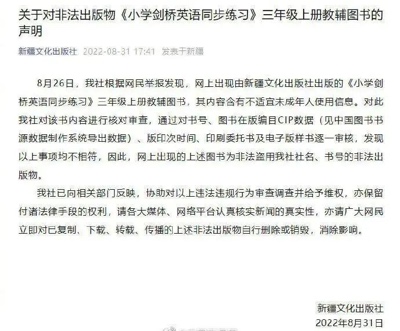 不过,在昨天下午17时41分,该“色情”教辅涉及的新疆文化出版社却通过其官方公众号发了一则声明:指该教辅是盗用其社名、出版号的非法出版物。