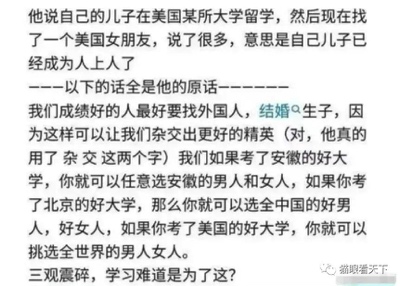 这种言论,与我国教育的主旨完全是背道而驰的,宣扬的已经不仅仅是崇洋媚外了,而是一种逆向种族主义思想。这样的言论居然能在中国的学校中登堂入室,可见教育系统存在着多大的问题。如果是在美国,陈教授敢于公开发表歧视种族的言论吗?分分钟让他进大牢、挨大嘴巴子。他可以问问他在美国的儿子,如果你宣扬白人至上的言论,会不会被起诉,甚至他的儿子不会被各种企业聘用。