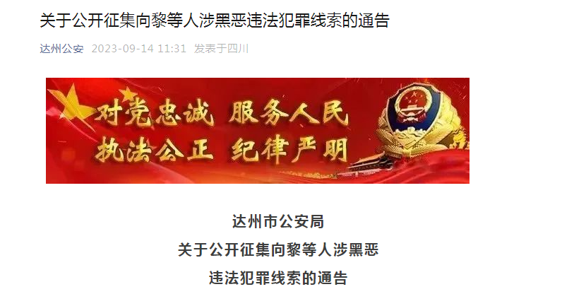 9月14日,达州公安发布了一条征集黑恶团伙违法犯罪线索的通告。