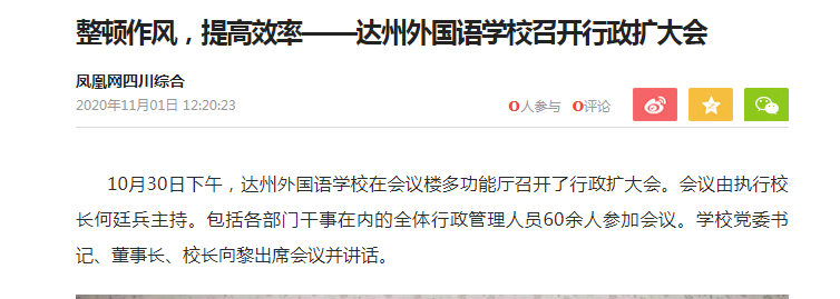 凤凰网在2020年的时候就报道过这样一条新闻:达州外国语学校召开行政扩大会。