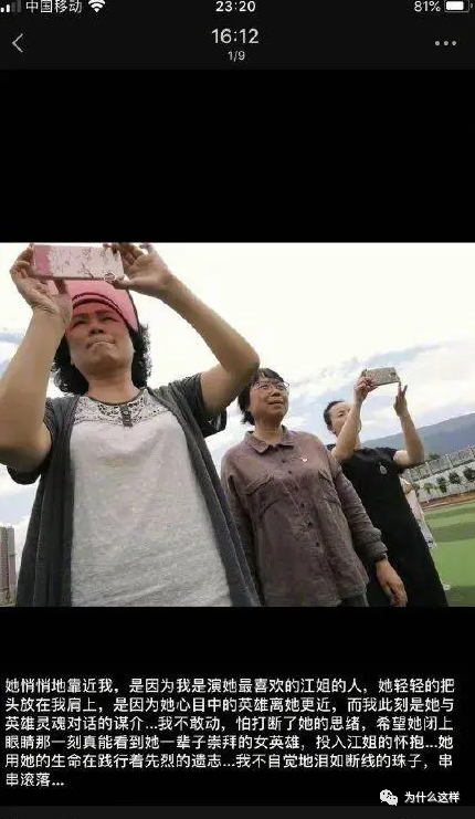 在张桂梅老师靠着《江姐》的扮演者闭上眼睛的那一刻,她想到了什么呢?是想问江姐和她的战友们自己作为一个共产党员合格吗?还是想告诉他们,自己将带着自己的学生继续为了伟大的共产主义信仰而奋斗呢?还是想着今天终于能够无愧地与江姐们站在一起了呢?我多次看到这组照片,每次都止不住泪如泉涌,我没有那些革命先烈那么伟大,也没有张桂梅老师那么高尚,但我知道,敬仰他们是一个人对于善良和崇高最基本的认知!
