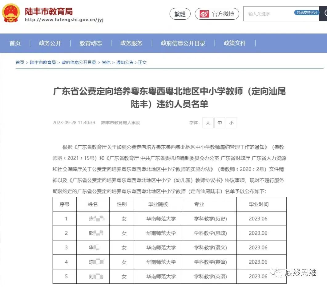 最近,广东省汕尾市陆丰市教育局、湛江市雷州市教育局等地发布公费定向培养的师范生违约名单,引起热议。不少网友对这一违约行为忿忿不平,央广网也撰文评论称“不能一罚了之”。