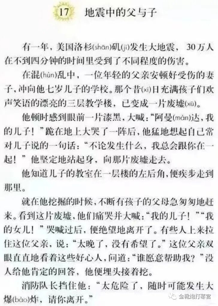再比如《地震中的父与子》,原文出自1944年的一本心灵鸡汤,故事原本的发生地是欧洲的亚美尼亚,并不是美国,但到了我们中国孩子的课本里,就被教育系统内的黑手改成了美国。