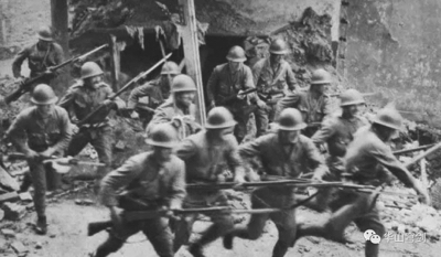 陈赓(上图前右一)住在二楼,他推开窗户,不顾自己的双腿有残疾,一跃跳下。这时,警卫连的战士们已经与日寇交上了火,陈赓也夺过一挺机枪,亲自向日寇扫射。