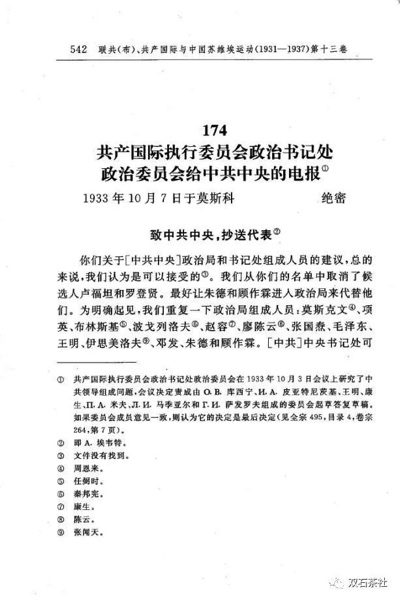 共产国际书记处1933年10月7日和11月4日分别有两电,提出对六届五中全会中共中央政治局书记处的人员组织意见。这个人员安排中,陈云也在书记处之列——
