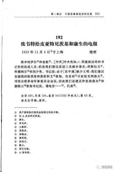 《组织史》有关于康生词条的注释是:①1937年12月,中央政治局向共产国际报吿中称“王明、陈云、康生留书〔记〕处工作”。