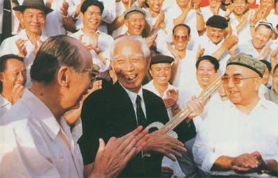 ◆1991年8月,王震在新疆喀什弹起少数民族代表送给他的冬不拉。