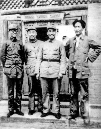 ◆毛泽东、朱德、周恩来、博古(从右到左)在延安合影。