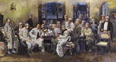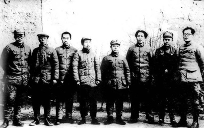 ◆1937年12月,中共中央在延安召开政治局会议。图为出席会议的部分人员合影。左起:张闻天、康生、周恩来、凯丰、王明、毛泽东、任弼时、张国焘。