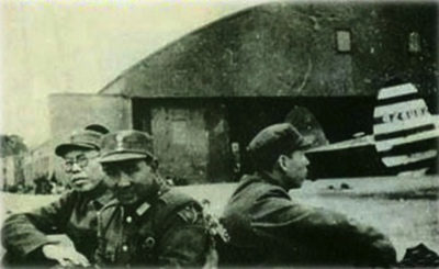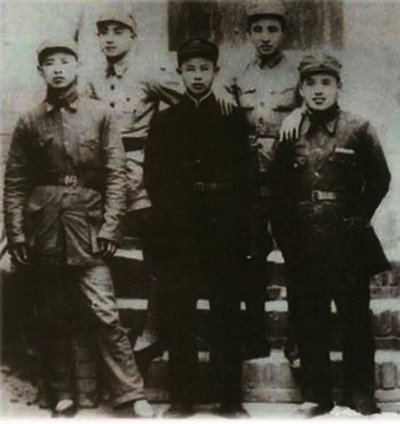◆1940年,抗日先遣纵队队司令员兼政治委员李聚奎(左五)与参谋长王波(左二)在山东朝成县杨庄。