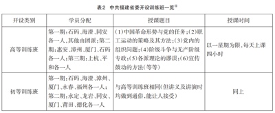 显而易见,上述“训练”内容与前文所述“教育”很难区分。中国共产党之所以经常以“训练”为词,是因为其形式和策略更为具体。1928年3月,广西特委就当前训练工作指出,除选拔党员分赴各区参加改组,分别开设普通训练班和特别训练班训练党员外,还将每年四月规定为“发展训练月”,以便积极“训练”党员,提高党内教育程度,造就中坚分子,预防党内投机分子问题蔓延。此外,各地党组织基于时间、党员的个人学习水平和受教育程度等方面的差异,相继开办各类训练班,以便训练党员干部,增强党员对党的策略和工作方法的深入认识,消除受训党员各种不良倾向。以福建省委开设的训练班为例,详见下表2。
