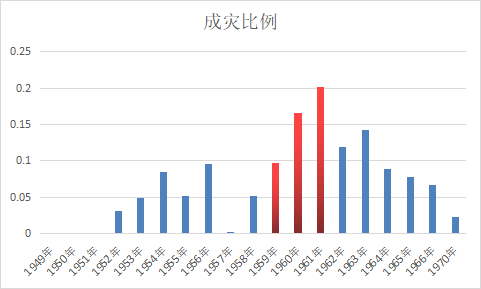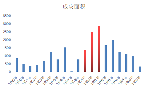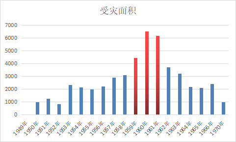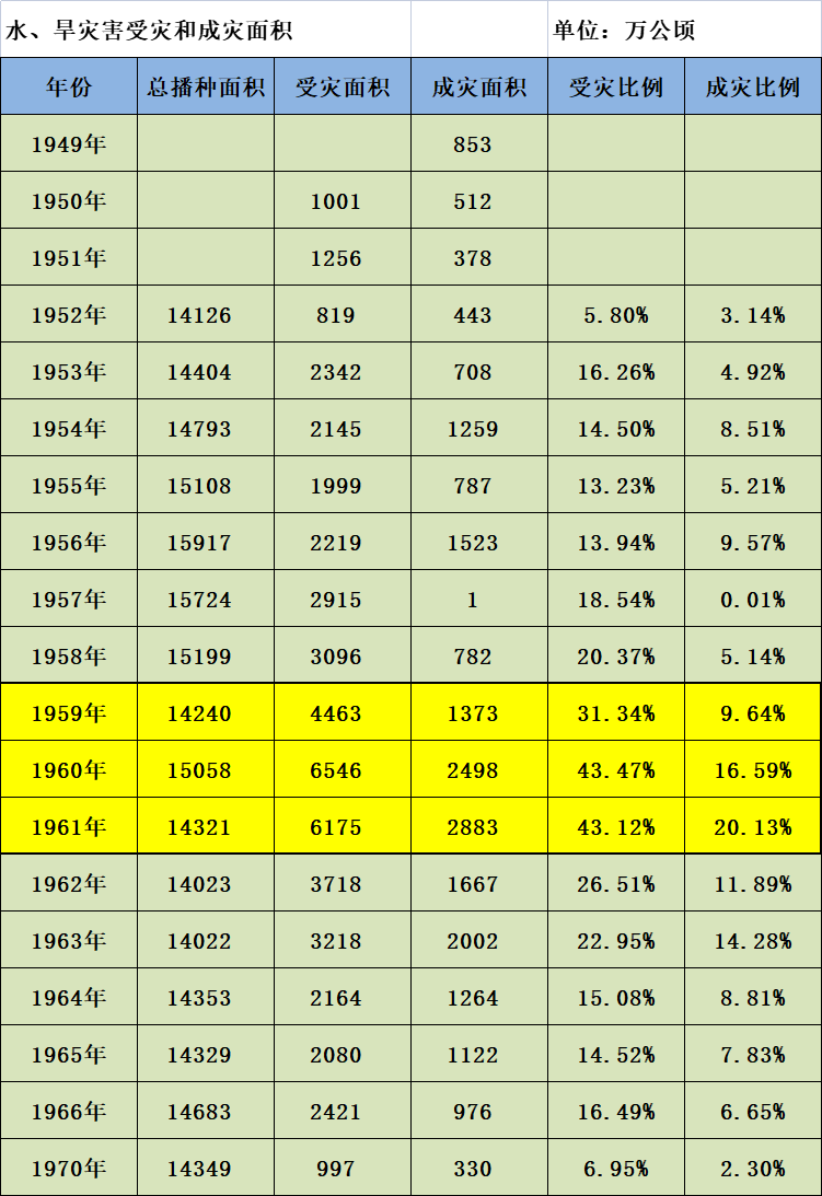 从上表可以看到,1959年的受灾面积为最高的三年,其中受灾比例在1960年、1961年分别达到了43.47%与43.12%。这在历史上也是极其罕见的。成灾比例在1960年与1961年分别达到了16.59%与20.13%,都是建国以来最高值。