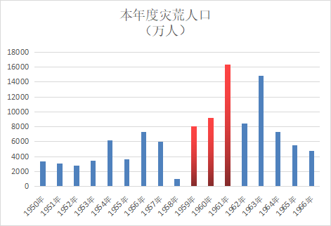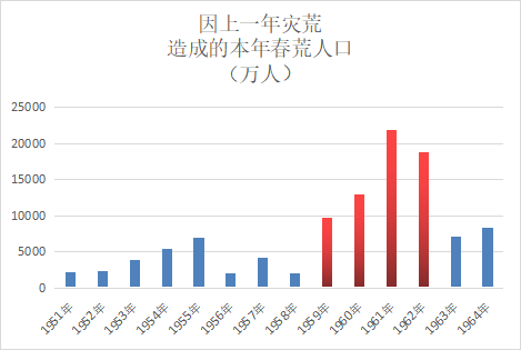 因上一年度灾荒造成的本年度春荒人口图(红色为1959、1960、1961、1962年度):
