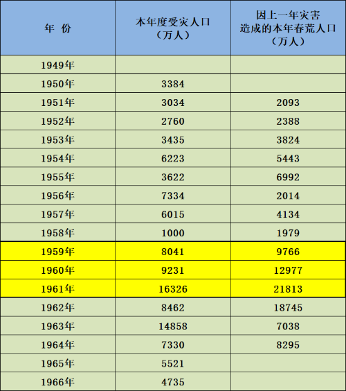 从上述数据可以得出结论,1959-1961年,新中国遭遇了建国以来最大的自然灾害,无论是受灾面积,还是受灾人口,均为新中国历年(包括以后)最严重的自然灾害。